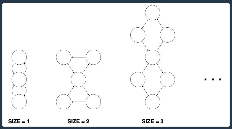 크기가 n인 8자 모양 그래프는 2n+1개의 정점과 2n+2개의 간선이 있습니다. 8자 모양 그래프는 크기가 동일한 2개의 도넛 모양 그래프에서 정점을 하나씩 골라 결합시킨 형태의 그래프입니다. 8자 모양 그래프의 형태는 다음과 같습니다.