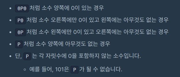 예를 들어, 437674을 3진수로 바꾸면 211020101011입니다. 여기서 찾을 수 있는 조건에 맞는 소수는 왼쪽부터 순서대로 211, 2, 11이 있으며, 총 3개입니다. (211, 2, 11을 k진법으로 보았을 때가 아닌, 10진법으로 보았을 때 소수여야 한다는 점에 주의합니다.) 211은 P0 형태에서 찾을 수 있으며, 2는 0P0에서, 11은 0P에서 찾을 수 있습니다.