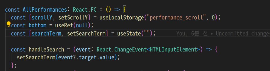 그리고 사용자의 event 를 받아와서 실시간으로 searchTerm을 변경해주는 기본적인 함수다.