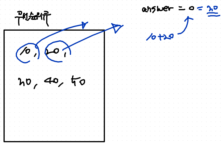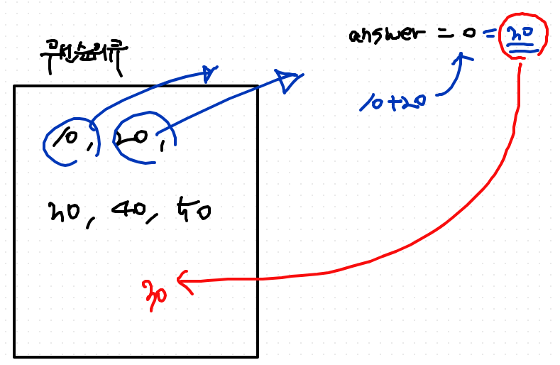 - 그 후, answer에다가 10 + 20을 더한 값을 더해준다 answer = 30