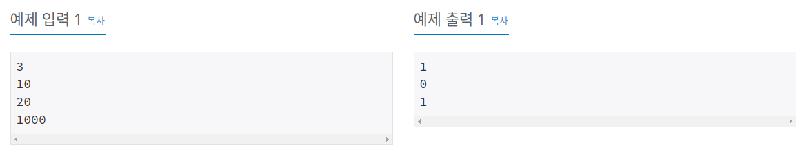 프로그램은 표준출력을 사용한다. 각 테스트케이스에대해 정확히 한 라인을 출력한다. 만약 K가 정확히 3개의 삼각수의 합으로 표현될수 있다면 1을, 그렇지 않다면 0을 출력한다.