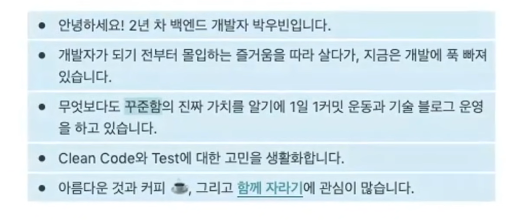 - 나는 어떤 개발자이고, 어떤 가치관을 갖고 있는지 소개