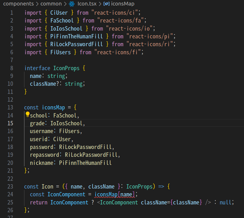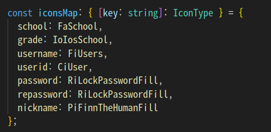 '{ school: IconType; grade: IconType; username: IconType; userid: IconType; password: IconType; repassword: IconType; nickname: IconType; }' 형식에서