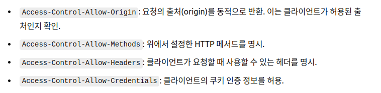 - http://localhost:3000: 로컬 개발 환경에서 프론트엔드와 백엔드가 통신할 때 허용.