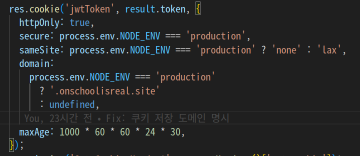 => 프론트와 백엔드 도메인 각각 다르기 때문에 sameSite가 none이 되어야 한다.