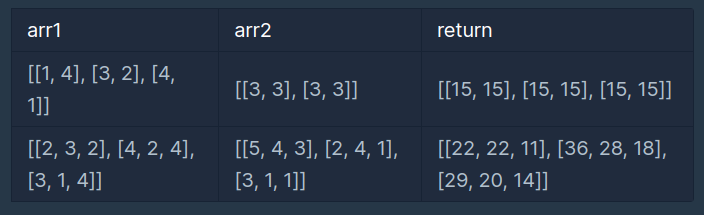 2차원 행렬 arr1과 arr2를 입력받아, arr1에 arr2를 곱한 결과를 반환하는 함수, solution을 완성해주세요.