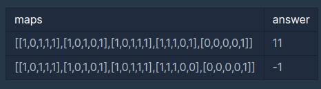 게임 맵의 상태 maps가 매개변수로 주어질 때, 캐릭터가 상대 팀 진영에 도착하기 위해서 지나가야 하는 칸의 개수의 최솟값을 return 하도록 solution 함수를 완성해주세요. 단, 상대 팀 진영에 도착할 수 없을 때는 -1을 return 해주세요.