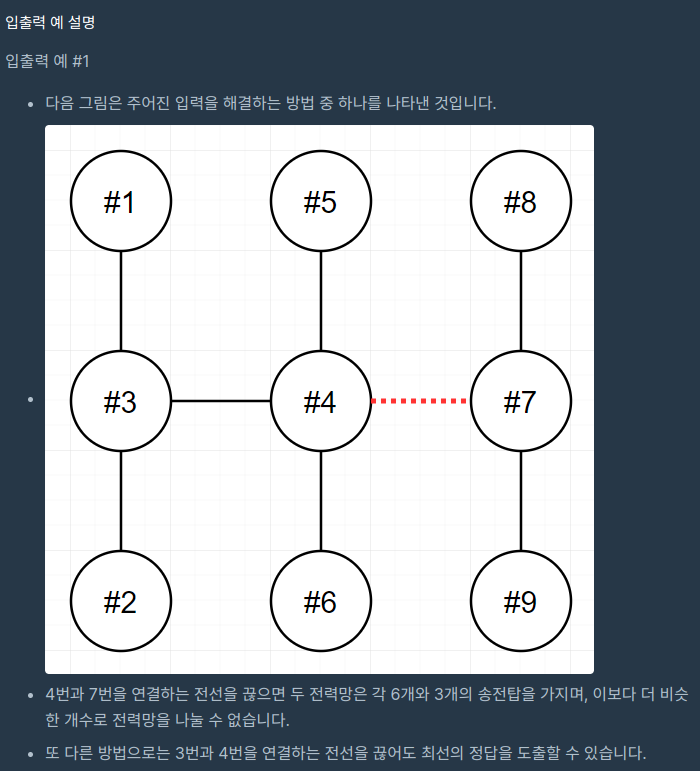 wires의 각 원소는 [v1, v2] 2개의 자연수로 이루어져 있으며, 이는 전력망의 v1번 송전탑과 v2번 송전탑이 전선으로 연결되어 있다는 것을 의미합니다.