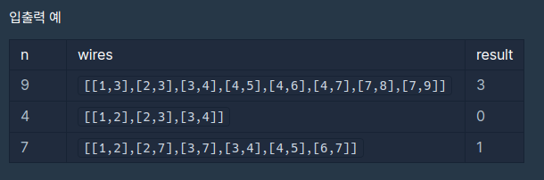 송전탑의 개수 n, 그리고 전선 정보 wires가 매개변수로 주어집니다. 전선들 중 하나를 끊어서 송전탑 개수가 가능한 비슷하도록 두 전력망으로 나누었을 때, 두 전력망이 가지고 있는 송전탑 개수의 차이(절대값)를 return 하도록 solution 함수를 완성해주세요.