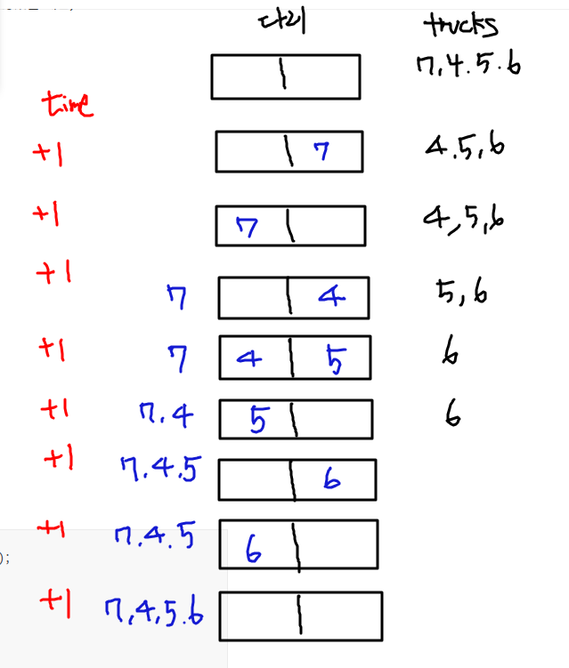 예를 들어, 다리의 길이 w는 2, 다리의 최대하중 L은 10, 다리를 건너려는 트럭이 트럭의 무게가 [7, 4, 5, 6]인 순서대로 다리를 오른쪽에서 왼쪽으로 건넌다고 하자. 이 경우 모든 트럭이 다리를 건너는 최단시간은 아래의 그림에서 보는 것과 같이 8 이다.